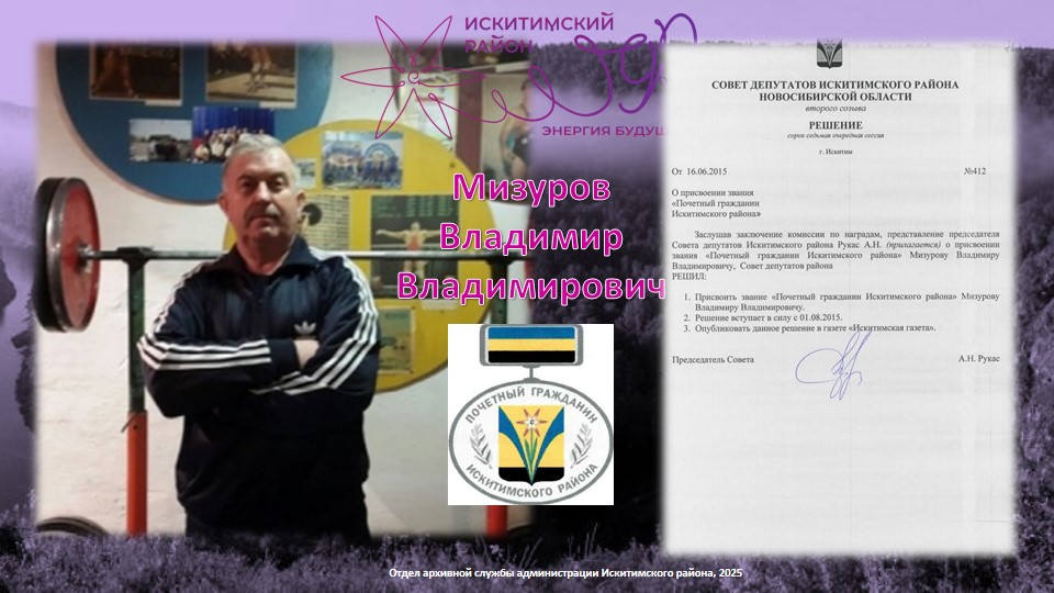 В. В. Мизуров – основатель тяжёлой атлетики в Искитимском районе. В 1980 году своими руками построил два специализированных спортивных зала в школе № 3 рабочего посёлка Линёво.