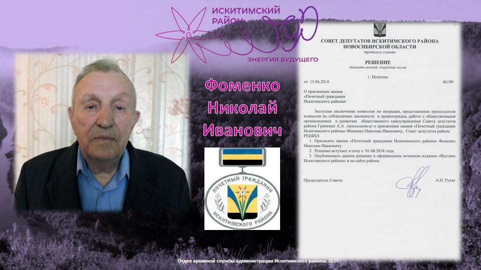 Фоменко Николай Иванович проявил себя знающим, принципиальным, требовательным к себе и подчиненным руководителем. Пользовался заслуженным уважением коллег и руководства Искитимского района, активно принимал участие в общественной жизни района.