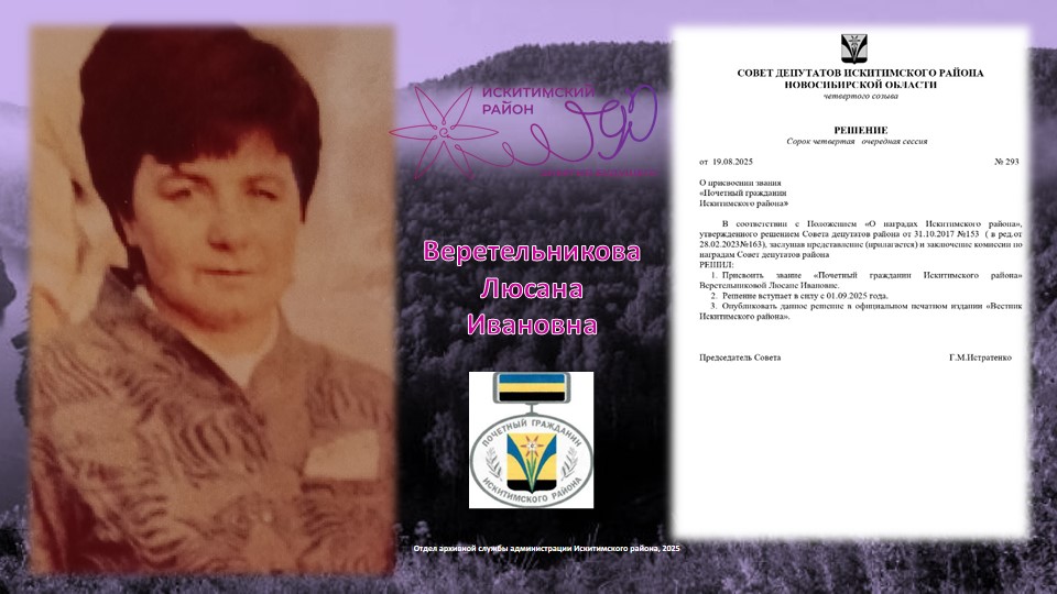 За большой вклад в развитие Искитимкого района в 2025 году решением Совета депутатов Искитимского района от 19.08.2025 № 293 Веретельниковой Л. И. присвоено звание «Почетный гражданин Искитимского района».