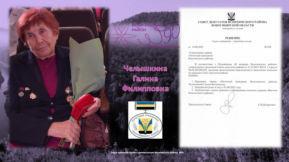 В 2025 году решением Совета депутатов Искитимского района от 19.08.2025 № 296 Челышкиной Г. Ф. присвоено звание «Почетный гражданин Искитимского района».