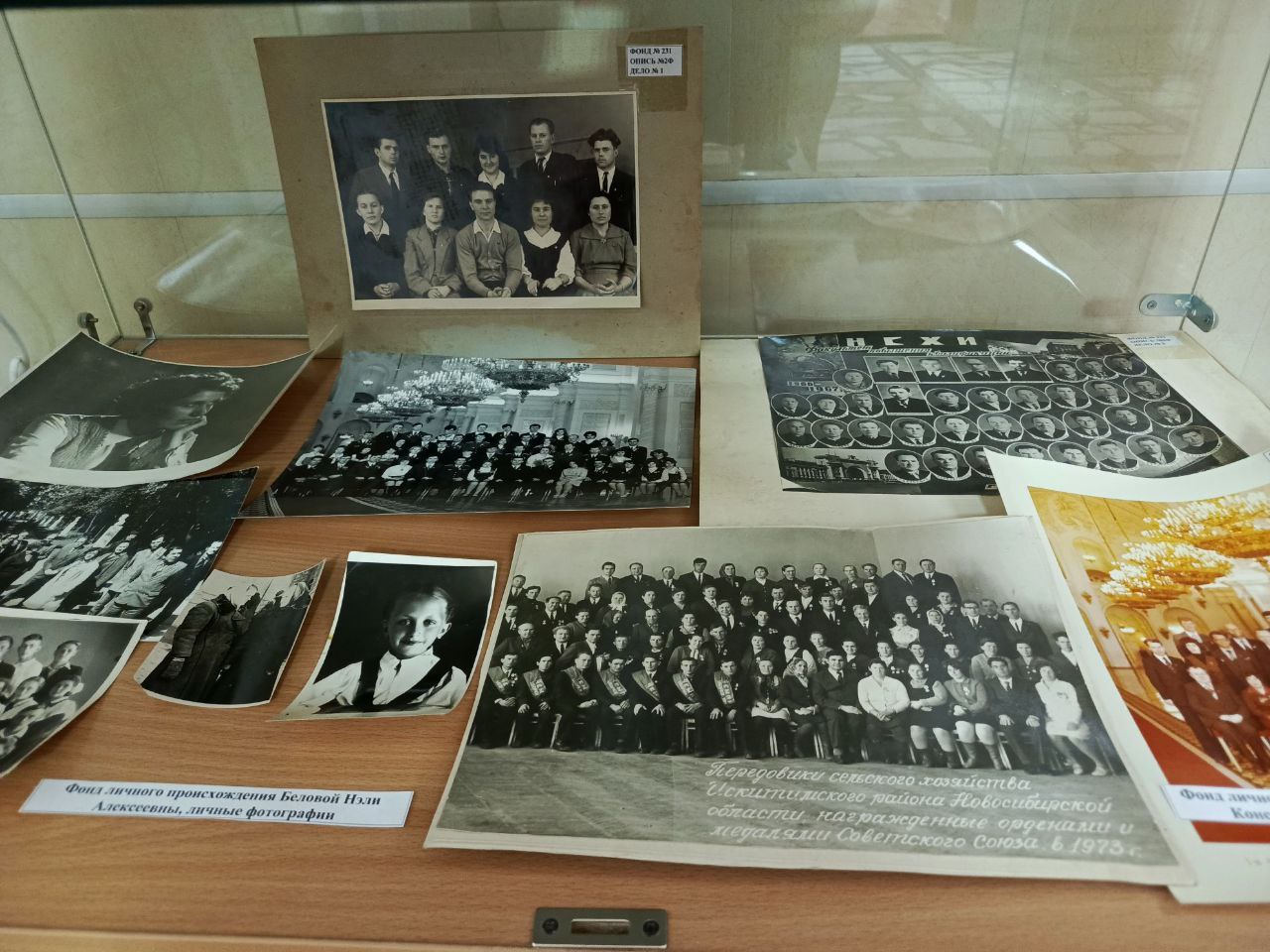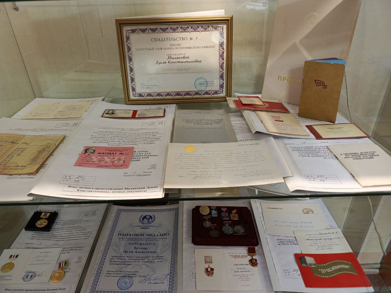 Так же, на выставке экспонированы документы из фондов личного происхождения двух знаковых в жизни района женщин – Беловой Нэли Алексеевны и Миляковой Луизы Константиновны. Эти личные документы, фотографии, коллекции значков, грамоты неизменно вызывали неподдельный интерес у всех зрителей передвижных контактных выставок в течение 2025 года, так же прошедших в рамках мероприятий к юбилею района.
